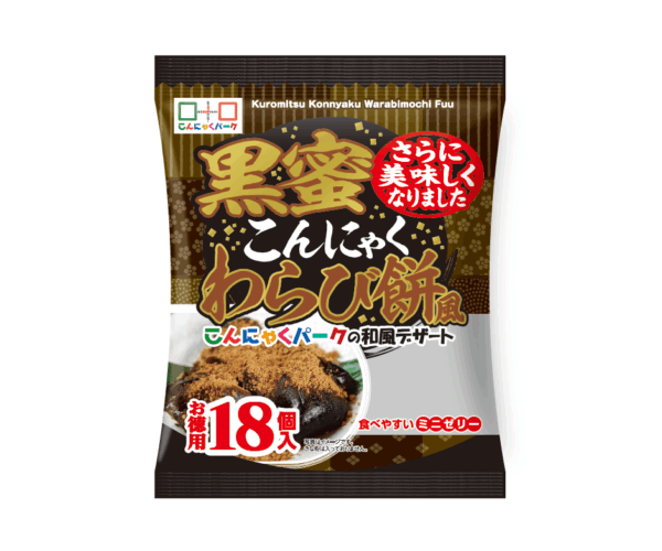 食べやすい個包装タイプの黒蜜こんにゃくわらび餅風のゼリーです。